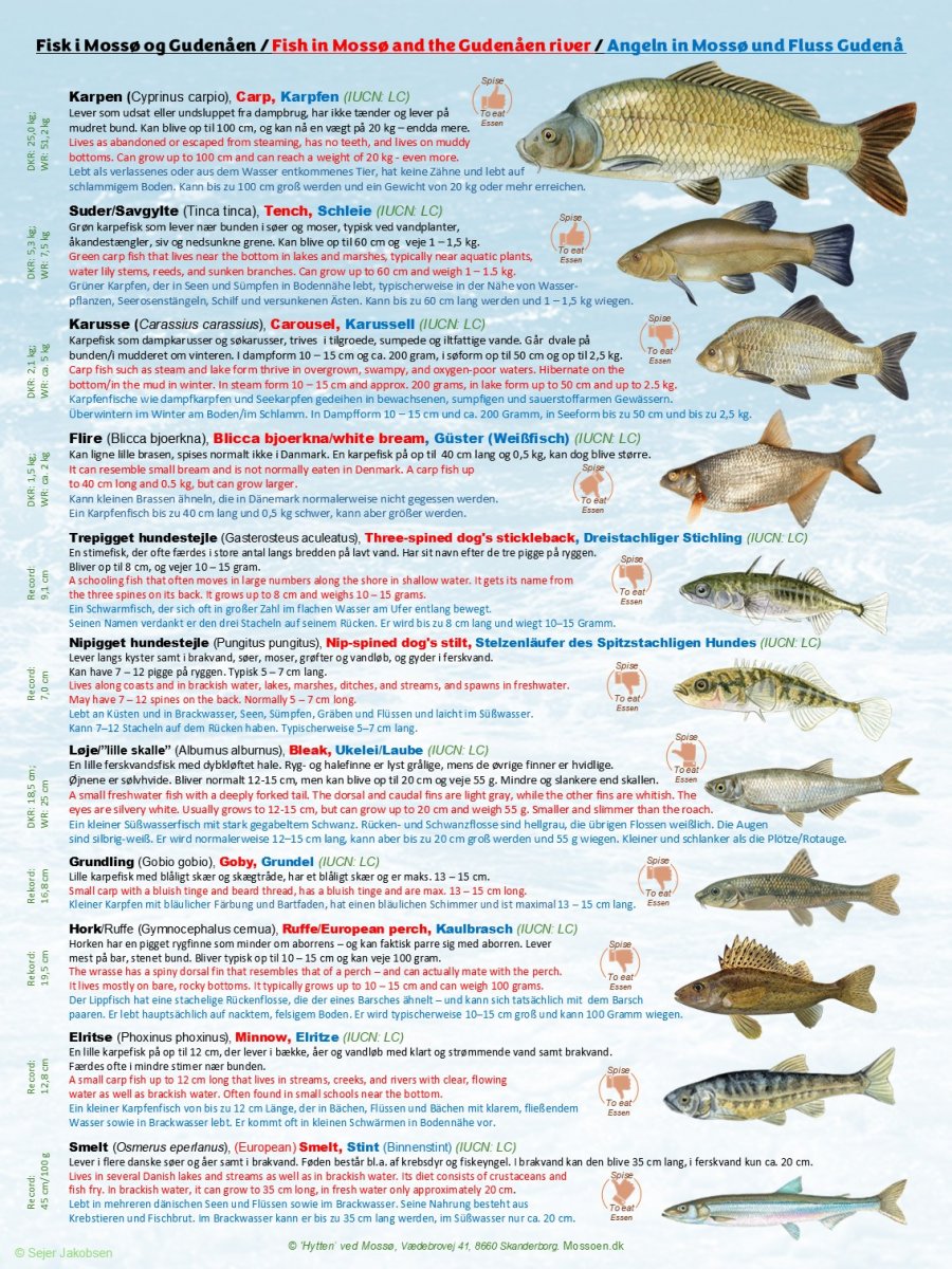 I den store sø Mossø i det midtjyske Søhøjlandet tæt på Skanderborg, findes der en betydelig artsrigdom af fisk. Antallet af varianter afhænger af kilden fra 19 til 24 arter, hvor de af os kendte her er opgjort til 21 forskellige fisk i forskellige størrelser, beskrevet i to plakater, der også ses i Hytten.